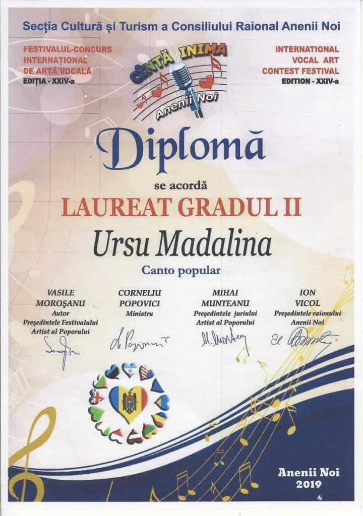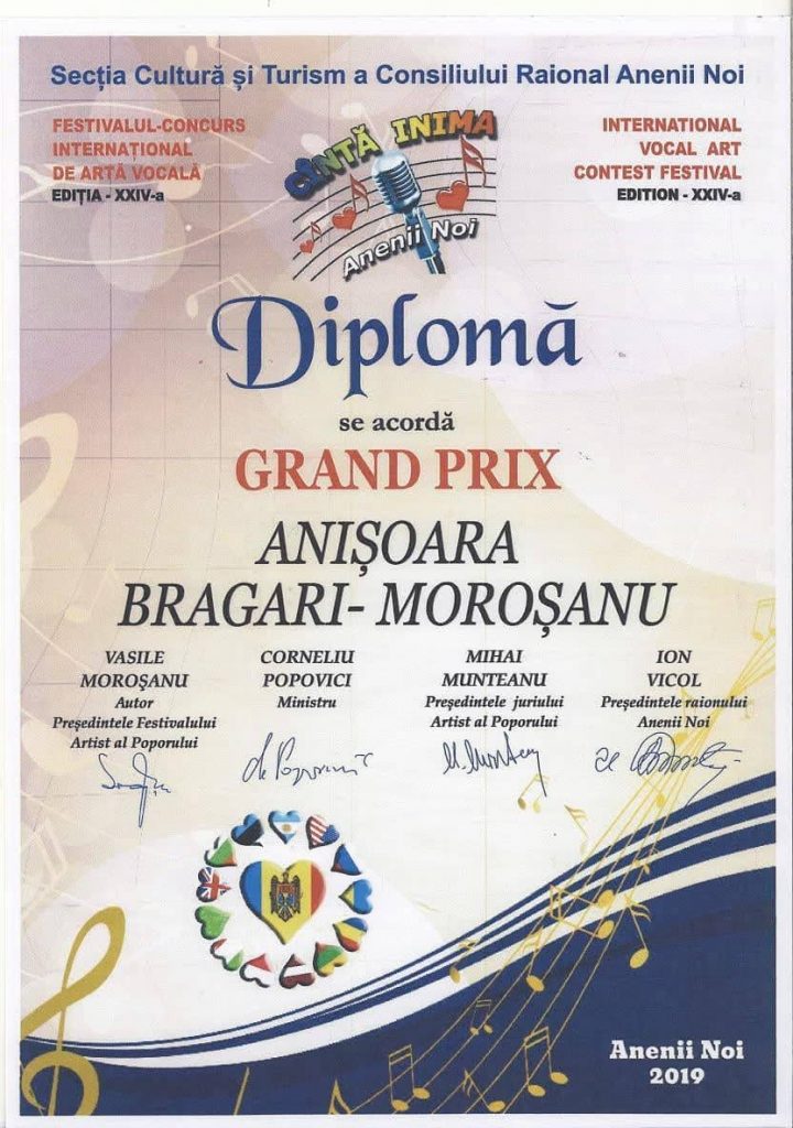 Secția Cultură și Turism a Consiliului Raional Anenii Noi a organizat Festivalul – Concurs Internațional de Artă Vocală, CÂNTĂ INIMA, ediția XXIV-a 2019, 2 decembrie Anișoara Bragari – GRAND PRIX Ana Felicia Caraji – diplomă Premiul Mare Mădălina Ursu – diplomă LAUREAT GRADUL II