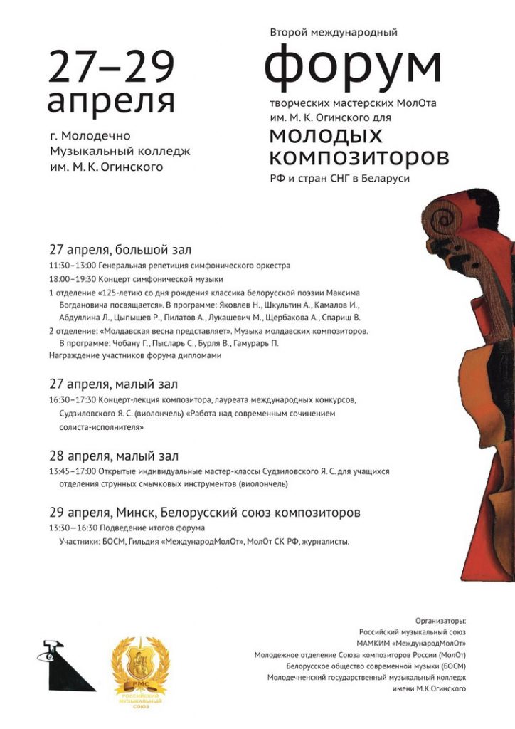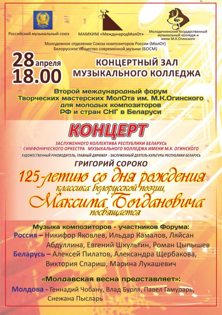 În perioada 26-29 aprilie 2017 la Colegiul de Muzică «M. K. Oginsky» din or. Molodecino (Republica Belarus) a avut loc Forumul Internațional al Atelierelor de Creație, organizate de Asociația tinerilor compozitori din Federația Rusa (MolOt) și Asociația de Muzica Contemporană din Belarus (BOSM), care a avut drept scop integrarea și sprijinul tinerilor compozitori profesioniști din Rusia (regiunile Tatarstan, Iacutia, Ural) și Belarus. Ca traineri au fost invitate personalități marcante din Rusia, Belarus, Moldova și alte țări.