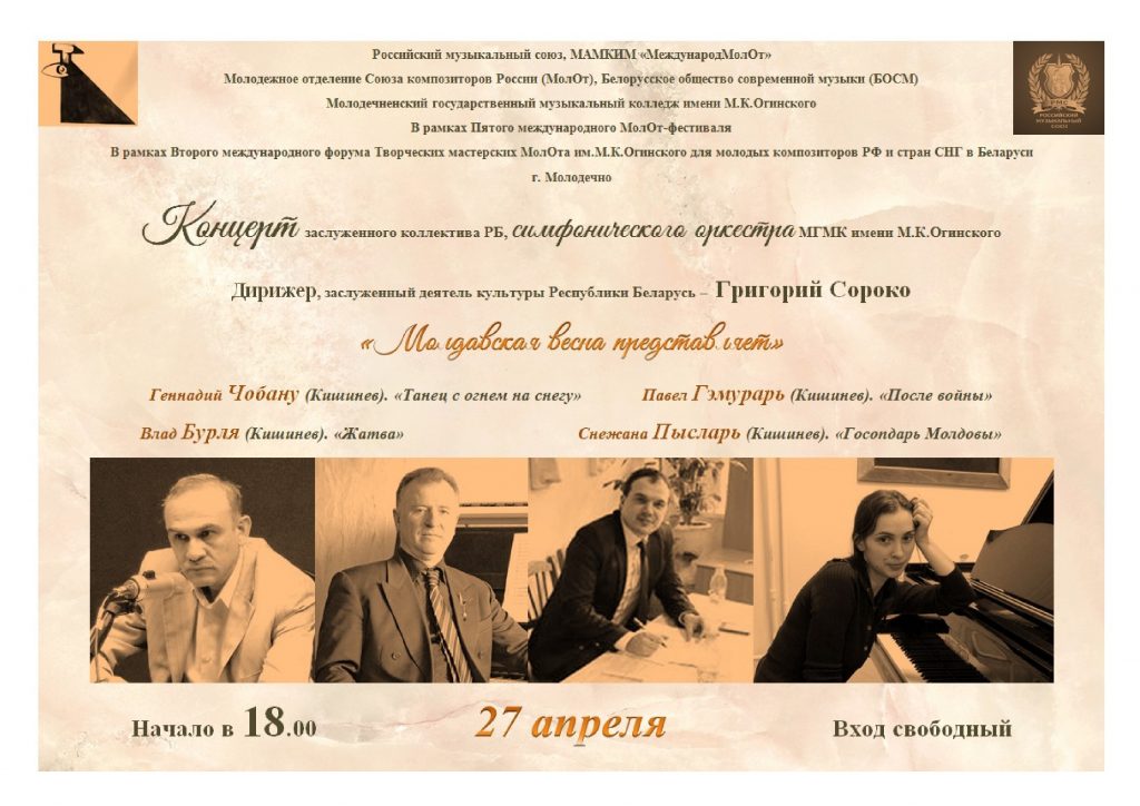 Momentul culminant al programului de patru zile a fost concertul orchestrei simfonice sub bagheta lucrătorului emerit al Republicii Belarus, cavaler al Ordinului „F. Skorina”, Grigori Soroka. Au fost interpretate lucrări simfonice ale participanților, scrise special pentru forum, precum și concertul „Primăvara Moldovenească“, în cadrul Festivalului Internațional al Muzicii Contemporane „Transfest”, ed. a V-a. Programul a inclus lucrări orchestrale ale compozitorilor contemporani din Moldova: „Tablouri postbelice“ de P. Gamurari, „Dans cu focuri pe zăpadă“ din suita „Riturile Primăverii“ de Gh. Ciobanu, scenetă rustică „Coasa“ de V. Burlea, variațiunile simfonice „Prince of Moldavia”, bazate pe muzica otomană a marelui cărturar Dimitrie Cantemir, de S. Pâslari. Publicul a apreciat cu ropote de aplauze programul prezentat. Organizatorii forumului au fost – Societatea muzicală din Rusia, Asociația tinerilor compozitori „MolOt International Group“, Asociația de muzică contemporană din Belarus. Scopul forumului s-a axat pe cunoașterea diversității culturale a țărilor reprezentate, a școlilor naționale componistice contemporane, stabilirea de relații culturale și cooperarea tinerilor compozitori din Europa Est și de Vest.